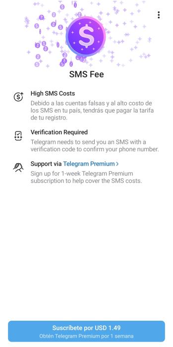 Nuestra cuenta de Telegram ha quedado a la deriva ya que ahora, cuando cambias de teléfono o reinstalas la app, Telegram te exige un pago de $1.49 para poder enviarte los SMS de activación, según nos enteramos ésto se debe a que muchas personas abusan de las solicitudes y muchas de ellas son fraudulentas para robar cuentas, por éste motivo Telegram para evitar ese gasto está cobrando.